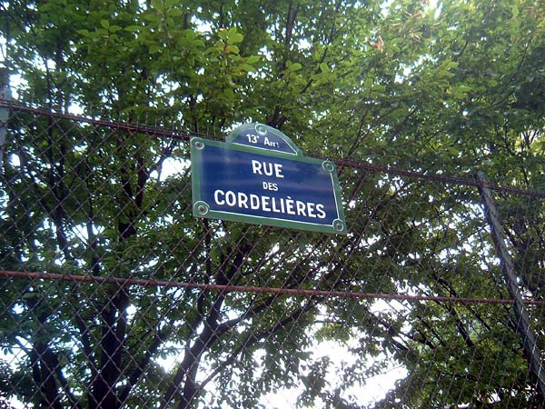 The Rue des Cordelières borders the present-day Square René-le-Gall, formerly a field that extended off the Field of the Lark into the backyard of the Gobelins factory.